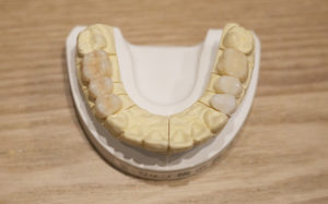 ◆白は白でも、プラチック(CR)とセラミックでは色合いが違います。プラスチックは長期的な目線では黄ばみやすく、汚れがつきやすいので応急処置としての意味合いが大きいです。セラミックはお茶碗や花瓶など、熱に強く変色しにくいのでお口の中に使われる素材として適しています。